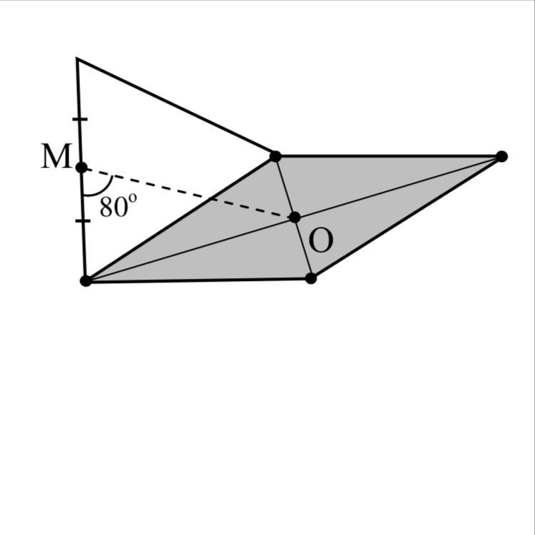 На стороне ромба построили равносторонний треугольник. Отрезок, который соединяет центр ромба с серединой стороны треугольника, образует с ней угол 80°.