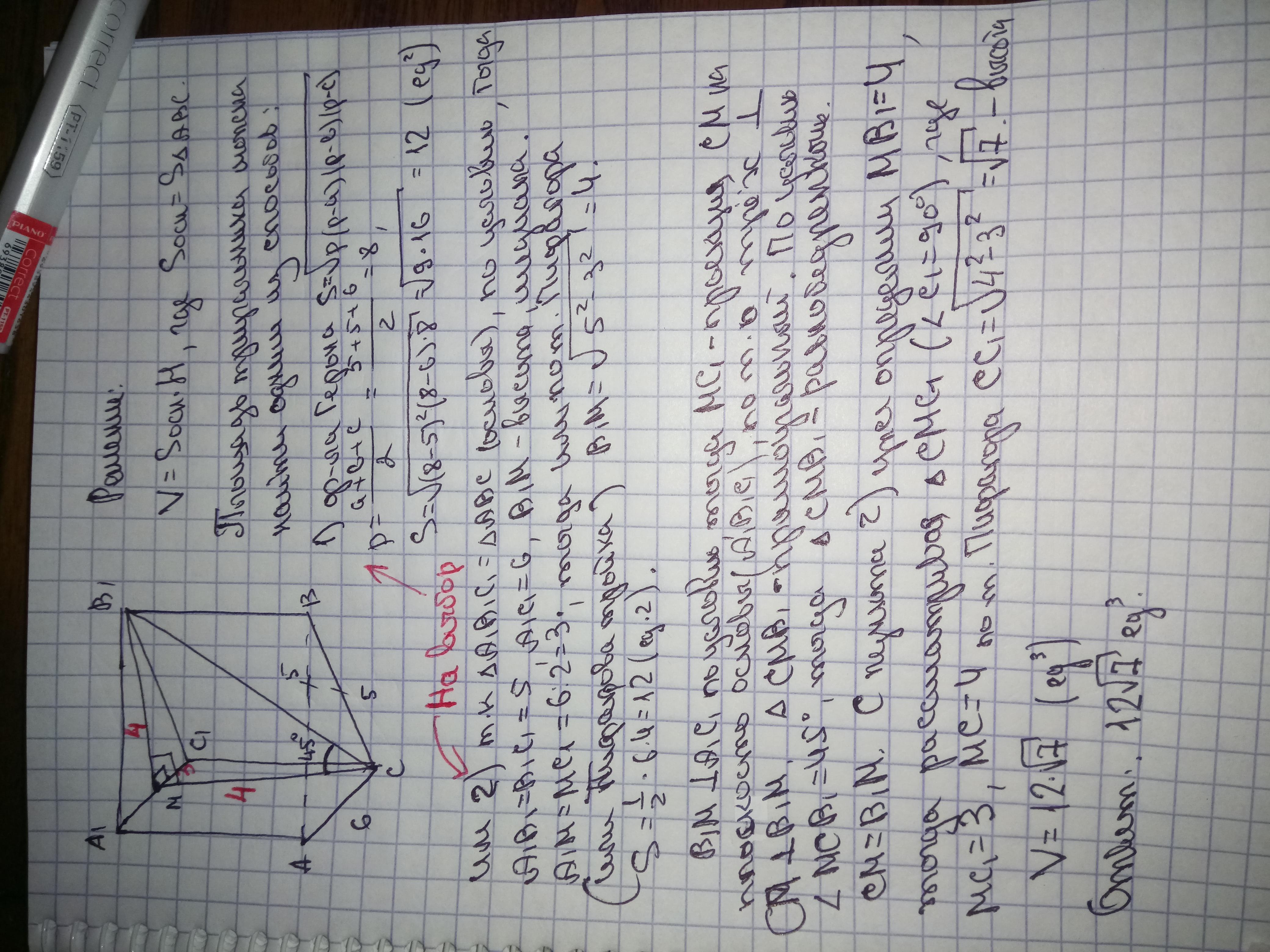 объем призмы равен произведению площади основания на высоту. т.е. площади треугольника АВС, (он же равен верхнему основанию) на СС₁, т.к. треугольник равнобедренный, то его посчитаем по формуле Герона. полупериметр равен (a+b+c)/2=(6+5+5)/2=8; 8-5=3; 8-5=3; 8-6=2; s=√(p*(p-a)*(p-b)*(p-c)=√(8*3*3*2)=3*4=12/ед. кв./