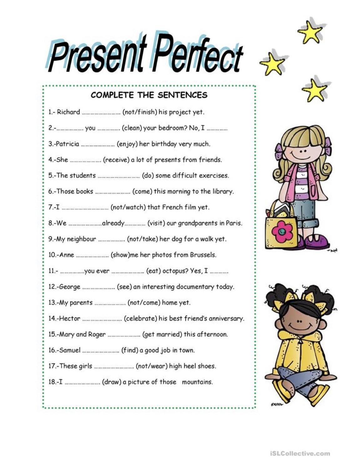 Present Perfect COMPLETE THE SENTENCES 1.- Richard (not/finish) his project yet. 2.- you (clean) your bedroom? No, I 3.-Patricia (enjoy) her birthday very much. 4.-She (receive) a lot of presents from friends. 5.- The students (do) some difficult exercises. 6.-Those books (come) this morning to the library. 7.-I (not/watch) that French film yet. 8.-We already...... (visit) our grandparents in Paris. 9.-My neighbour (not/take) her dog for a walk yet. a 10.-Anne (show)me her photos from Brussels. 11.- -you ever (eat) octopus? Yes, I 12.-George (see) an interesting documentary today. 13.-My parents (not/come) home yet. 14.-Hector (celebrate) his best friend's anniversary 15.-Mary and Roger (get married) this afternoon 16.-Samuel (find) a good job in town. 17.- These girls (not/wear) high heel shoes. 18.-I (draw) a picture of those mountains,