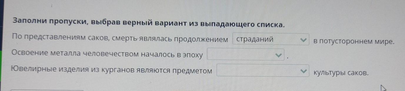 Заполни пропуски, выбрав верный вариант из выпадающего списка. По представлениям саков, смерть являлась продолжением страданий Освоение металла человечеством началось в эпоху Ювелирные изделия из курганов являются предметом 4)