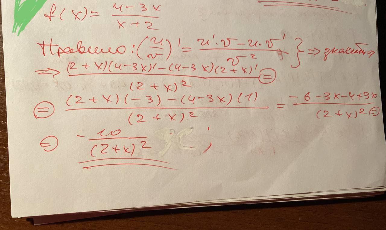 ((4-3x)'*(x+2)-(x+2)')(4-3x))/(x+2)²=(-3*(x+2)-1*((4-3x))/(x+2)²=