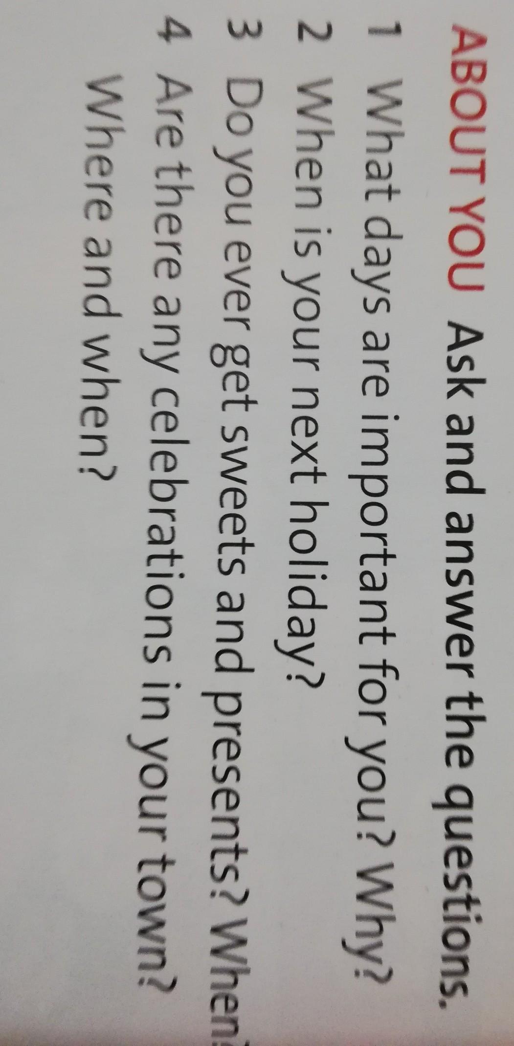4.есть ли какие-нибудь празники в твоем городе?где и когда?-i know one celebration day in my town.this is city day. (...)дальше узнай когда у тебя день города и просто напиши дату там где щяс три точки