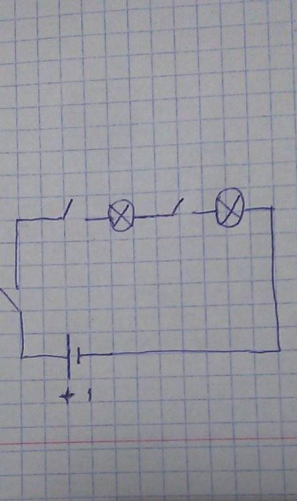 7. Нарисуйте схему соединення батарейки, двух лампочек и ключа, в которой включение и выключенне лампочек производится одним ключом