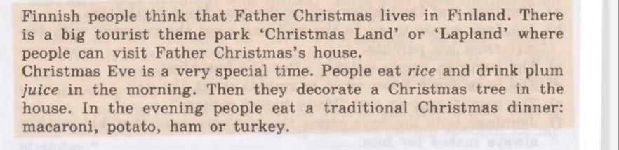 Финниш пипл синк зэт фавер кристмас ливс ин финланд. Зер ис э биг туристс фим пак кристмас лэнд ор лапланд вэ пипл кэн визит фаверс кристмас хаус . кристмас ив ис а спэшл тайм. пипл ит райс энд дринк плам джус ин зе монин. Зен зей декорэйт э кристмас три ин зе хаус. Ин зе ивнинг пипл ит э традишнл кристмас динер: мэкарони, потэйто, хэм ор тёкей.