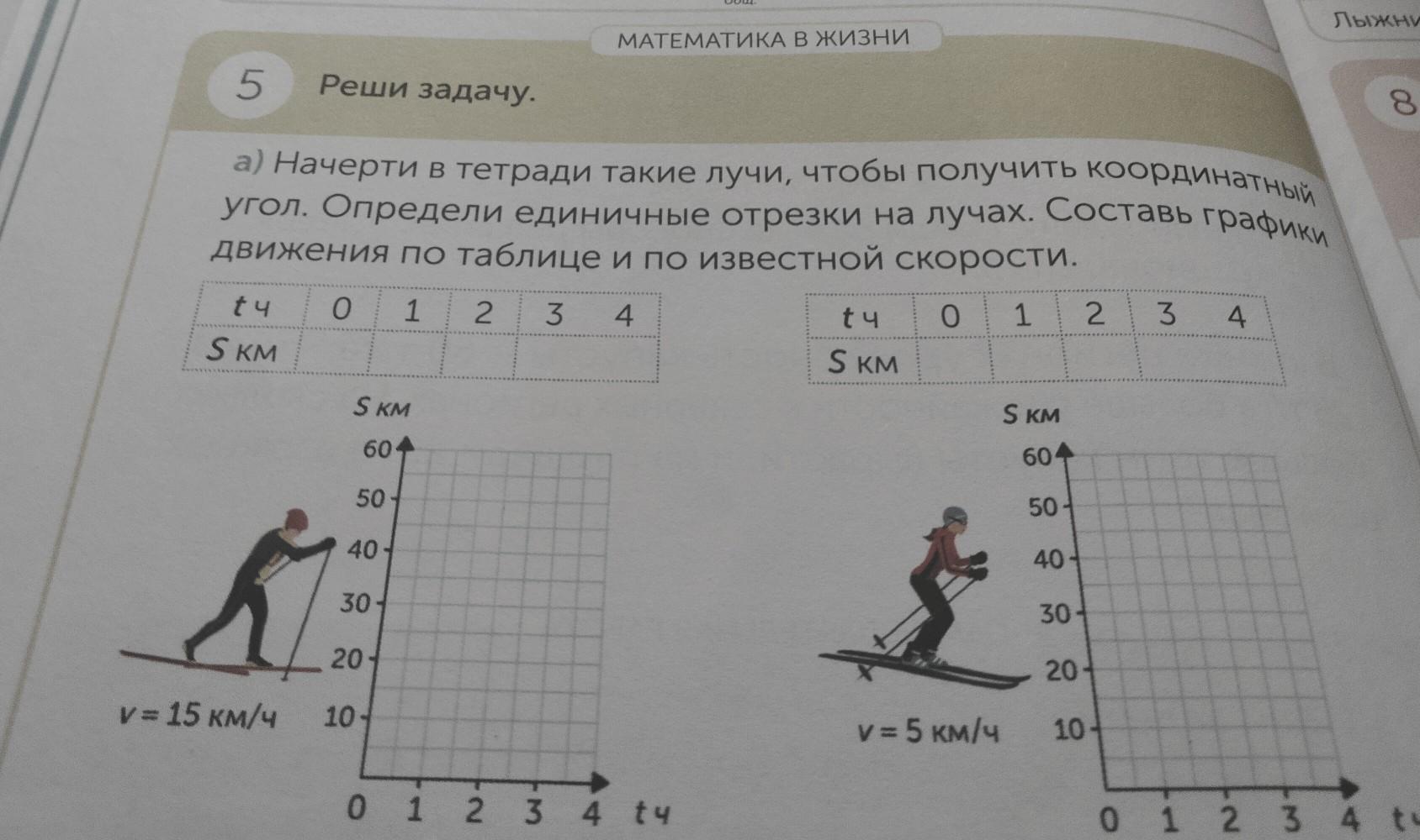 МАТЕМАТИКА В ЖИЗНИ 7 Реши задачу. Лы» Лы: 5 угол. Определи единичные отрезки на лучах. Состоеѕ а) Начерти в тетради такие лучи, чтобы получить коор движения по таблице и по известной скорости. 4 t Ч 3 2 0 1 0 1 S KM ty 2 S KM 3 S KM S KM 60- 604 50 50- 401 40- 30 30 20 20 у 5 км/ч 101 у= 15 км/ч 10- 0 1 2 3 4 14