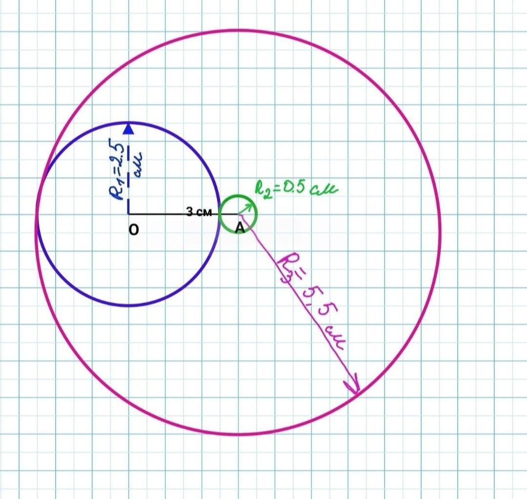Отметьте точки О и А расстояние между которыми равно 3 см начертите окружность с центром в точке о радиусом 2,5смвычислите радиус окружности с центром в точке О которые касаются построенной окружности.Начертите эти окружности