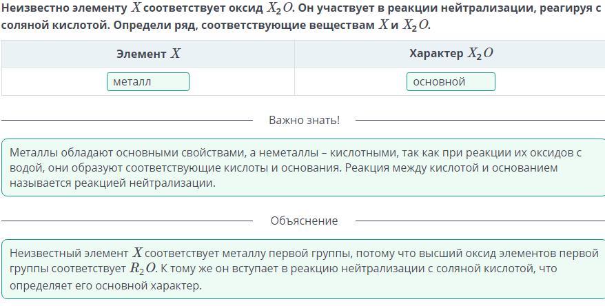 Неизвестно элементу X соответствует оксид X2O. Он участвует в реакции нейтрализации, реагируя с соляной кислотой. Определи ряд, соответствующие веществам X и X2O. Элемент X Характер X2O