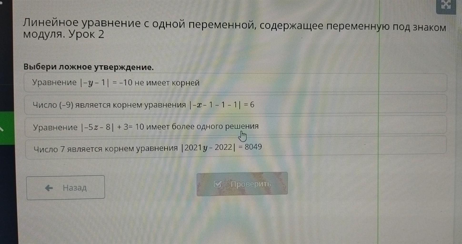 х Линейное уравнение с одной переменной, содержащее переменную под знаком модуля. Урок 2 Выбери ложное утверждение. Уравнение |-у-1| = -10 не имеет корней Число (-9) является корнем уравнения |-- 1 - 1 - 1 | = 6 Уравнение 1-5z - 8| +3= 10 имеет более одного решения thing Число 7 является корнем уравнения |2021 у - 2022| = 8049 В Проверить Назад