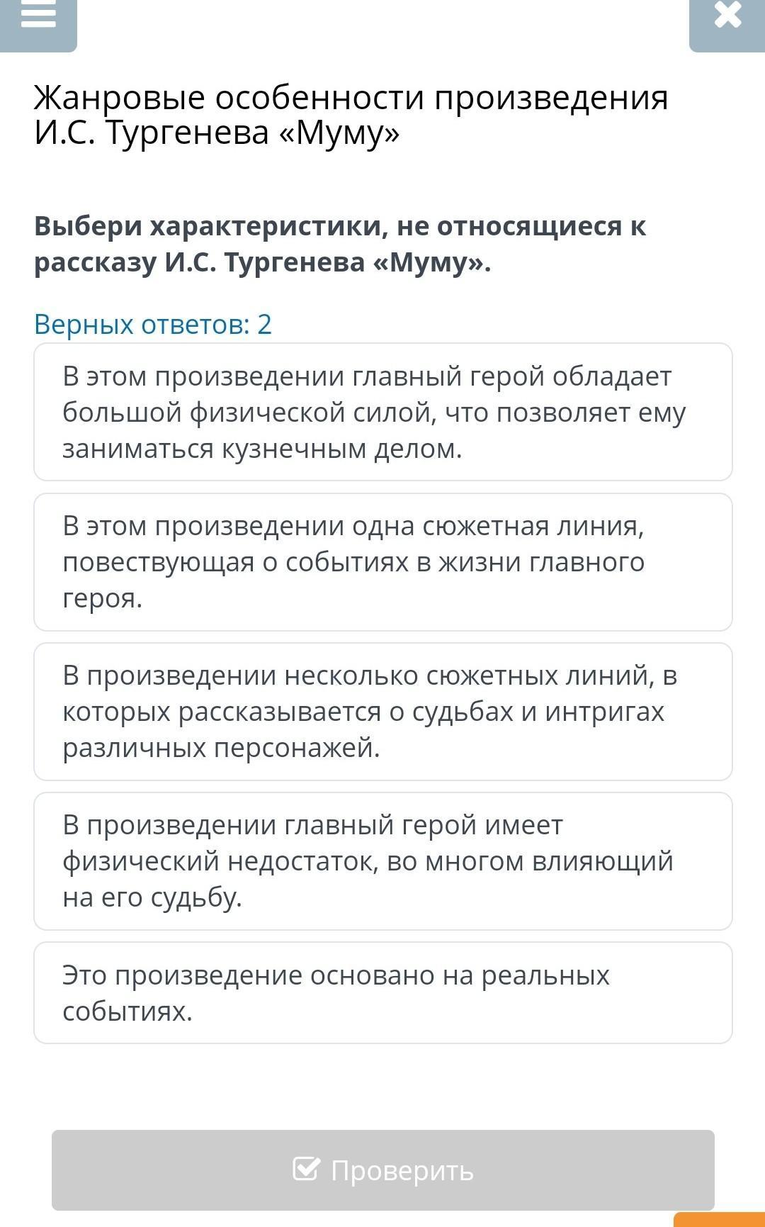 Жанровые особенности произведения И.С. Тургенева «Муму» Выбери характеристики, не относящиеся к рассказу И.С. Тургенева «Муму». Верных ответов: 2 В этом произведении главный герой обладает большой физической силой, что позволяет ему заниматься кузнечным делом. В этом произведении одна сюжетная линия, повествующая о событиях в жизни главного героя. В произведении несколько сюжетных линий, в которых рассказывается о судьбах и интригах различных персонажей. В произведении главный герой имеет физический недостаток, во многом влияющий на его судьбу.