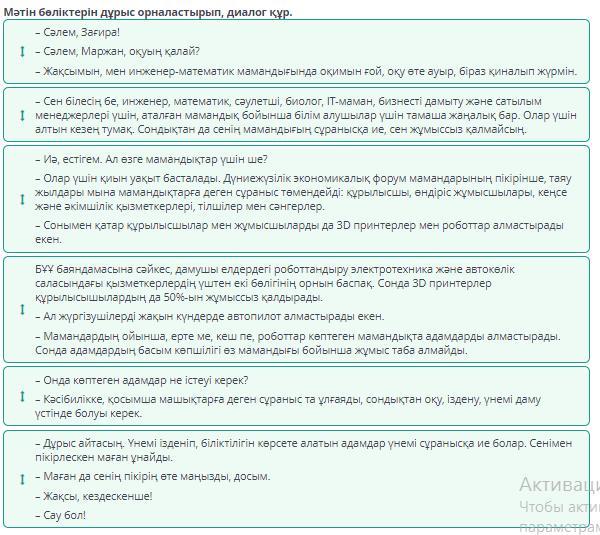 Мәтін бөліктерін дұрыс орналастырып, диалог құр.