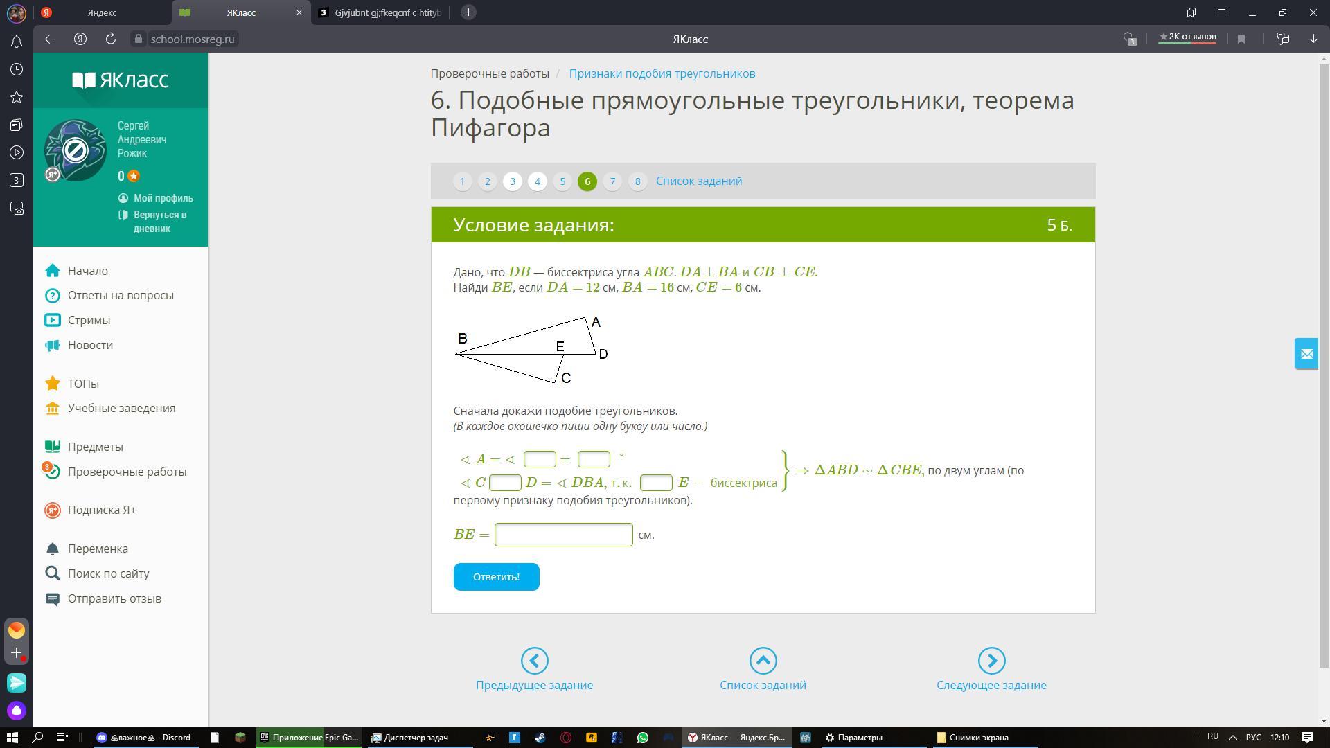 Ответ: ВЕ=10см