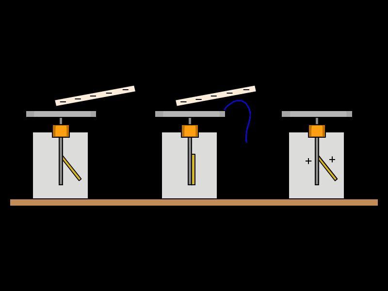 На рисунке ниже предложен вариант, как зарядить электроскоп через влияние, но так, чтобы при удалении заряженного тела электроскоп всё ещё сохранял заряд. Изучите изображение и объясните, как происходит процесс электризации электроскопа.