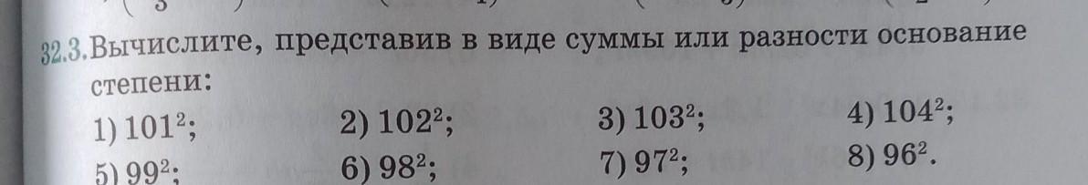 32.3. Вычислите, представив в виде суммы или разности основание степени: 1) 1012; 2) 1022; 3) 1032; 4) 1042; 5)992; 6) 98%; 7) 972; 8) 962