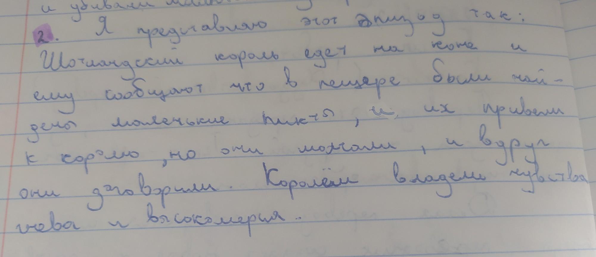 2. Как вы себе представляете эпизод встречи шотландского короля и маленьких пик- Тов? Какие чувства владели королём? Қакими словами автор выразил своё отноше- ние к героям? (вересковый мед)