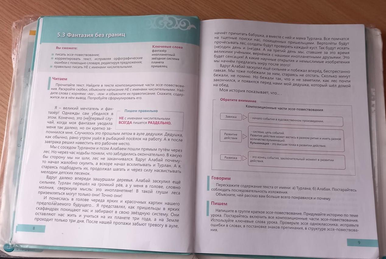 ко- 5.3 Фантазия без границ Вы сможете: а писать эссе повествование, и корректировать текст исправляя орфографические ошибсии с помощько словаря, редактируя предложения; правильно писать не с именами числительными Ключевые слова Фантазёр инопланетный Звёздная система Планета пришелец начнет причитать бабушка, а вместе с ней и мама Турлака Все помча на тщетные поиски нас похищенных пришельцами Вертолеты будаг прочесывать лес, солдаты будут проверять каждый кус. Так буд са (не)один день и (не)два. А на третий день мы старшие за это время великими учеными, вернемся с нашими инопланетными друзьями. Это будет сенсация! А какие научные открытия и немыслимые изобретения Мы начнем предлагать миру после этого! Вдруг Алабай заскулил еще сильнее и побежал вперед, беспрестанно гавкая. Мы тоже побежали за ним, стараясь не отстать Сколько ми бежали, не помню. Но бежали так, что и не заметили, как лес почти закончился, и появился перед нами мой дедушка, который шел домой на обед. Моя история показывает, что... Читаем Прочитайте текст. Найдите в тексте композиционные части эссе-повествова- ния. Раскройте скобки, объясните написание НЕ с именами числительными. Най- вие слова с корнями члаг- -ло- и объясните их правописание. Скажите, содер- жится ли в нем вывод Попробуйте сформулировать его. Обратите внимание Композиционные части эссе-повествования Завязка начало события в художественном произведение Развитие действия - система, цепь событий Развитие действие может вестись о разном ритме и мера количество кульминаций Кульминация - это высшая точка развитии действие Развязка то конец события, заключительный момент в развитие действия Я — великий мечтатель и фан- Пишем правильно газер! Однажды сам убедился в этом. Конечно, это (не)первый слу- НЕ с именами числительными чай, когда моя фантазия уводила ВСЕГДА пишется РАЗДЕЛЬНО. меня так далеко, но он крепко за- помнился мне Случилось это прошлым летом в ауле дедушки. Дедушка, как обычно, рано утром ушёл в рыбацкий посёлок на работу. А я после Завтрака решил навестить его рабочее место. Мы с соседом Турланом и псом Алабаем пошли прямым путем через лес Но через час ходьбы поняли, что заблудились окончательно. В какую бы сторону мы ни шли, лес не заканчивался. Вдруг Алабай почему- то начал жалобно скулить, а вскоре начал всхлипывать и Турлан. Ая, стараясь подбодрить их, продолжал шагать и через силу насвистывать мелодии детских песенок. Вдруг далеко впереди зашуршали деревья. Алабай заскулил ещё сильнее, Турлан перешел на громкий рев, а у меня в голове, словно молния, сверкнула мысль: это инопланетяне! В такой глуши леса приземляться могут только они! Точно они! и понеслась в голове череда ярких и красочных картин нашего предполагаемого будущего... я представлял, как пришельцы в ярких скафандрах похищают нас и забирают в свою звёздную систему. Они оставляют нас жить и учиться на их планете три года, а на Земле проходит только три дня. После нашей пропажи забьют тревогу в ауле, Говорим Перескажите содержание текста от имени: а) Турлана; б) Алабая. Постарайтесь соблюдать последовательность изложения Объясните, чей рассказ вам больше всего понравился и почему Пишем Напишите в группе краткое эссе-повествование. Придумайте историю по теме урока. Постарайтесь включить все композиционные части эссе-повествования, Ис