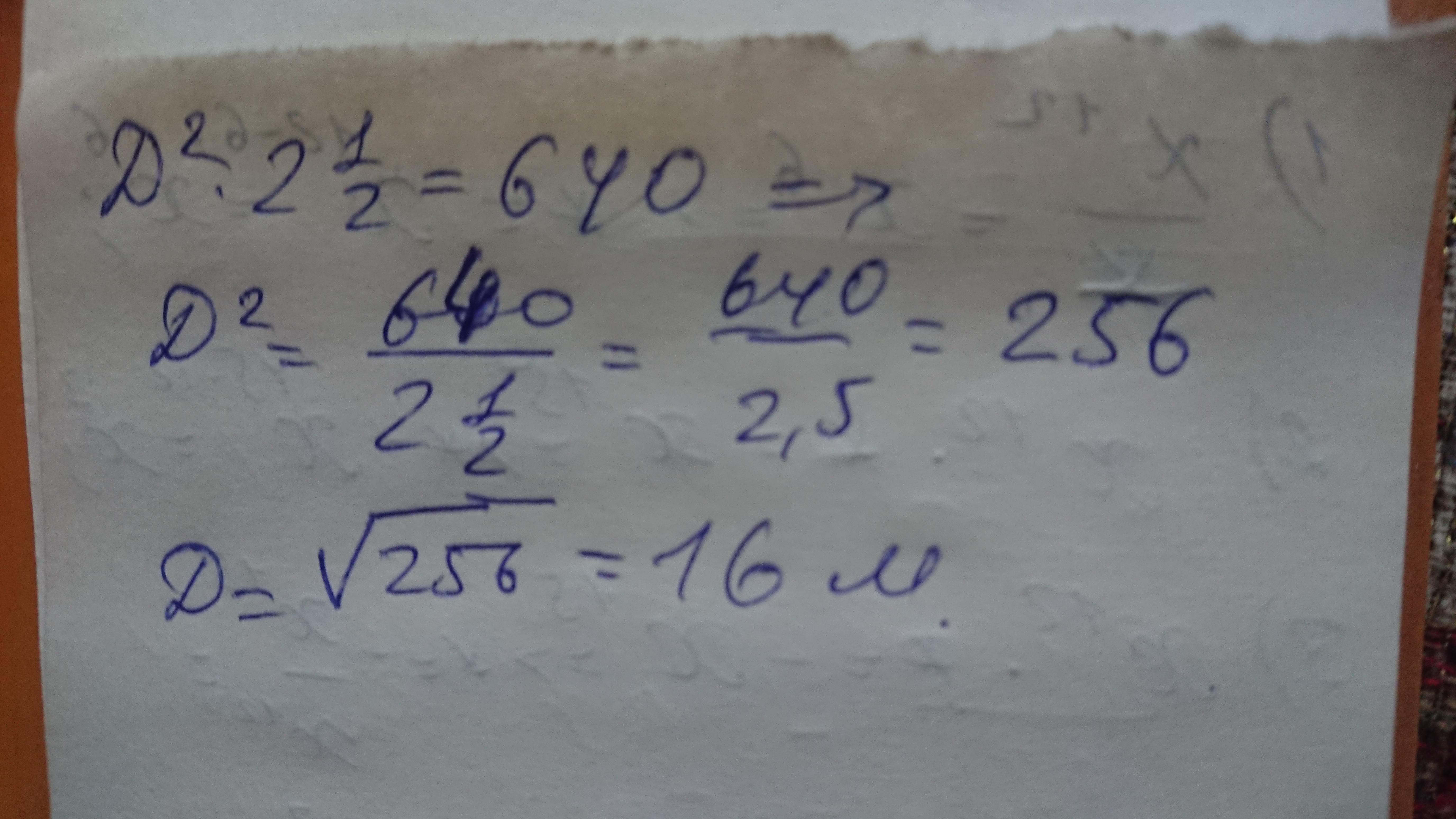 D^2*2 1/2=640м, D^2=640:2 1/2=256м, D=16м
