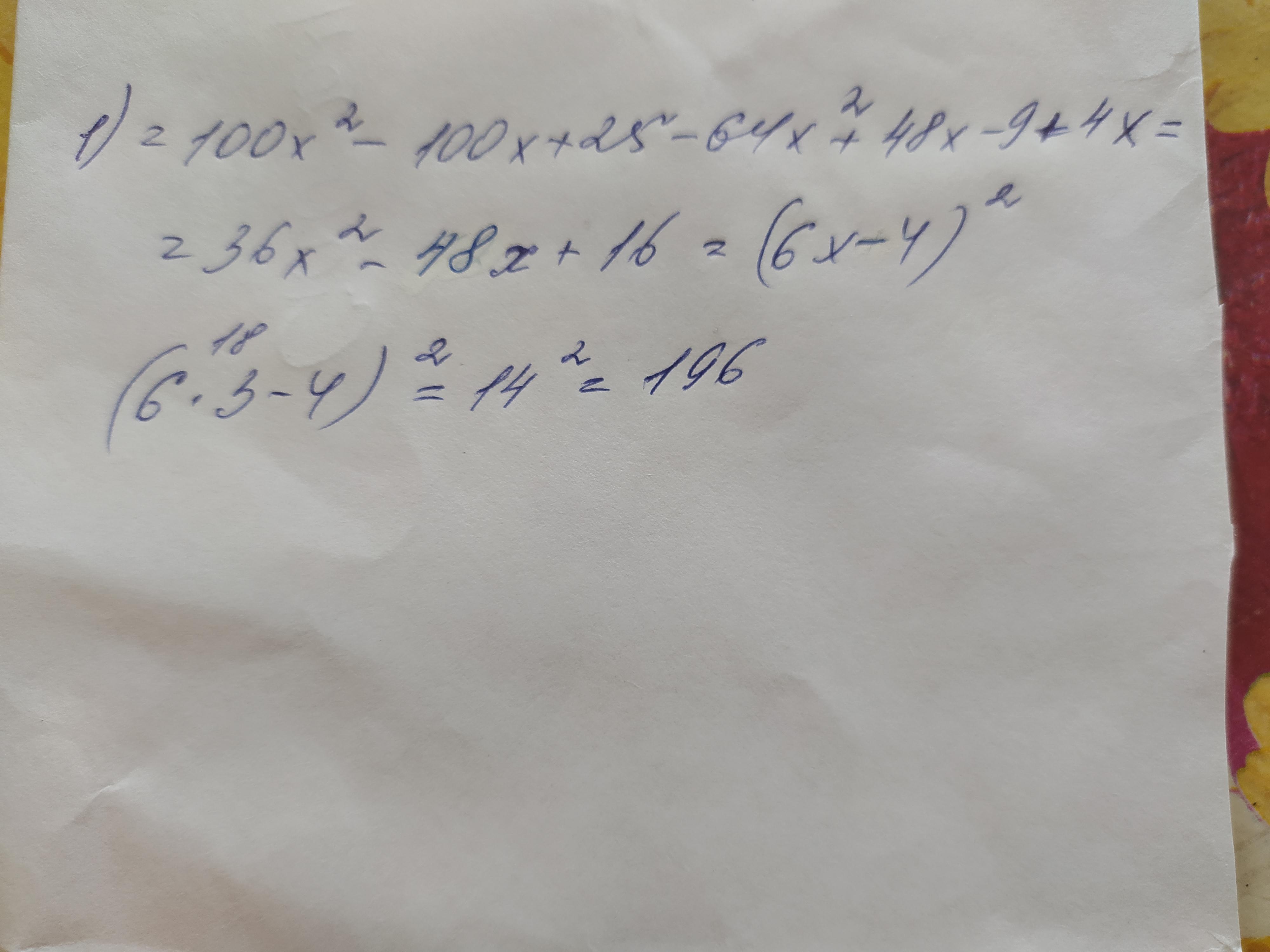 =100x^2-100x+25-64x^2+48x-9+4x=36x^2-48x+16=(6x-4)^2=(6*3-4)^2=14^2=196
