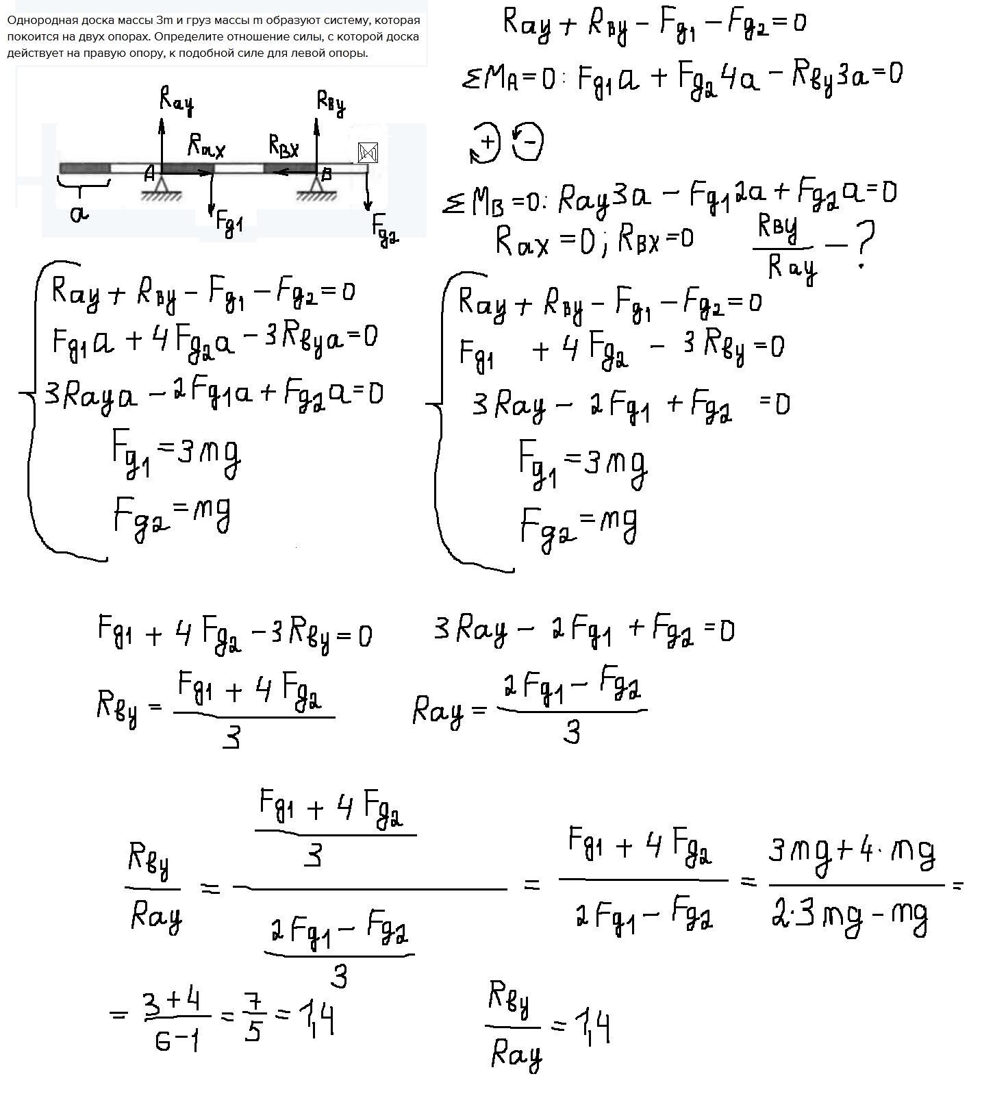 Однородная доска массы 3m и груз массы m образуют систему, которая покоится на двух опорах. Определите отношение силы, с которой доска действует на правую опору, к подобной силе для левой опоры.