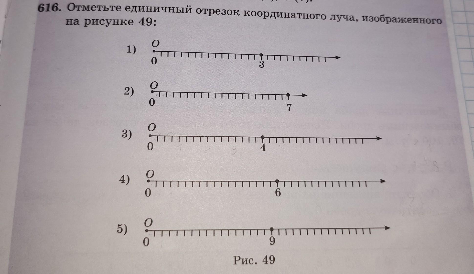 616. Отметьте единичный отрезок координатного луча, изображенного на рисунке 49: 1) 2) 3) 4) 5) Рис. 49