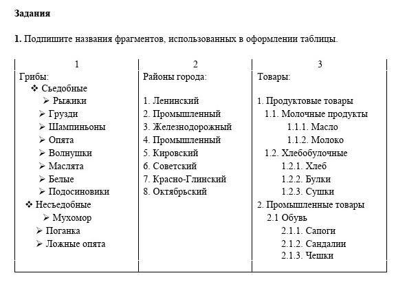 1. Подпишите названия фрагментов, использованных в оформлении таблицы.