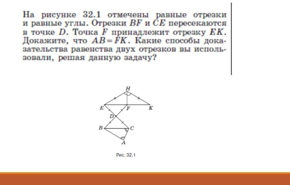 - Рассматривали эти отрезки как стороны двух треугольников, и доказывали, что эти треугольники равны.