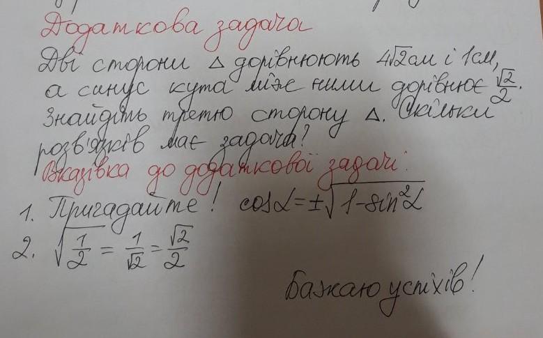 = √( 1² + ( 4√2 )² - 2* 1* 4√2 * √2/2 ) = √( 1 + 32 - 8 ) = √25 = 5 ( см ) .