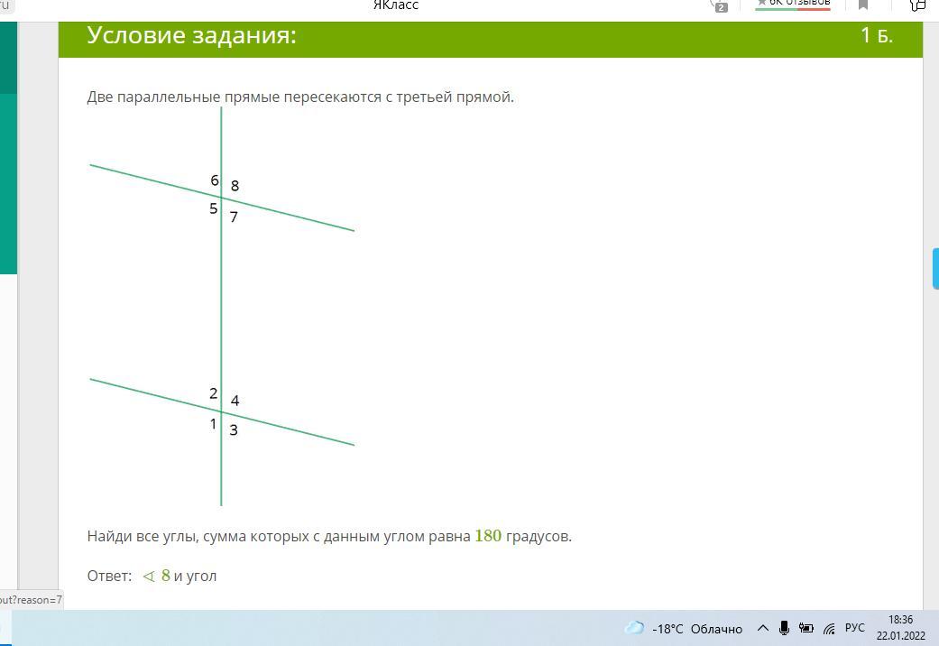 СРОЧНО!!!!!две параллельные прямые пересекаются с третьей прямой найди все углы сумма которых с данным углом равна 180 градусов угол 8 и ...
