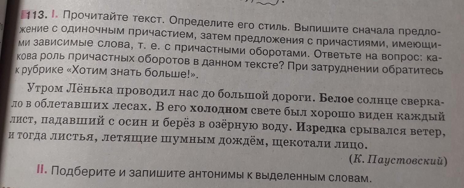 предложения с причастными оборотами: 1)В его холодном свете был хорошо виден каждый лист, падавший с осин и берез в озерную воду.