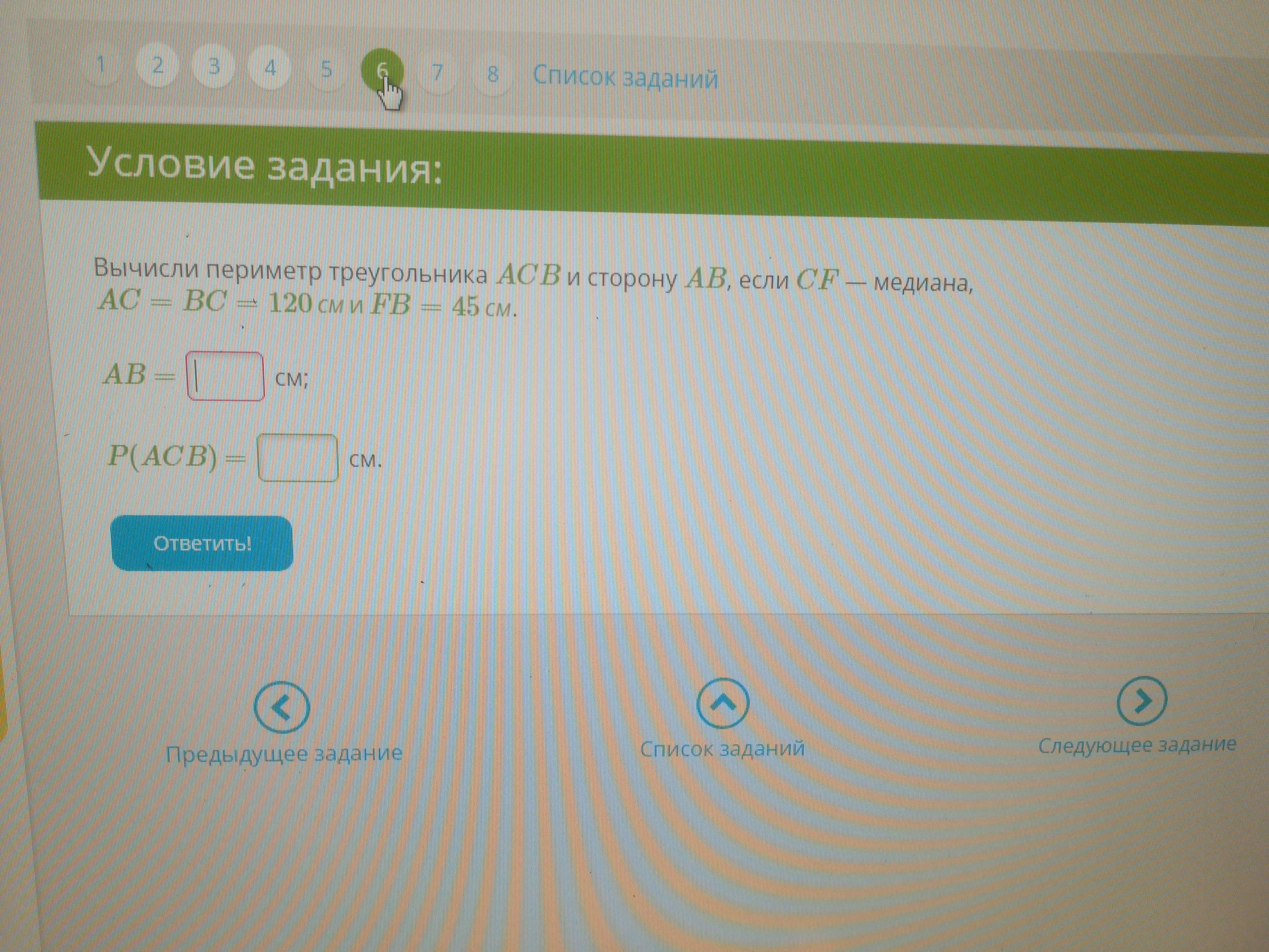 Медиана CF делит отрезок AB на 2 равные части, следовательно отрезок AB=2*FB, AB=2*45=90, P(ACB)=AB+BC+AC=120+120+90=330.
