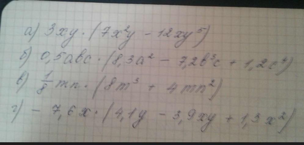 г) -7,6x·(4,1y-3,9xy+1,3x²)=-7,6x·4,1y-7,6x·(-3,9xy)-7,6x·1,3x²=-31,16xy+29,64x²y-9,88x³
