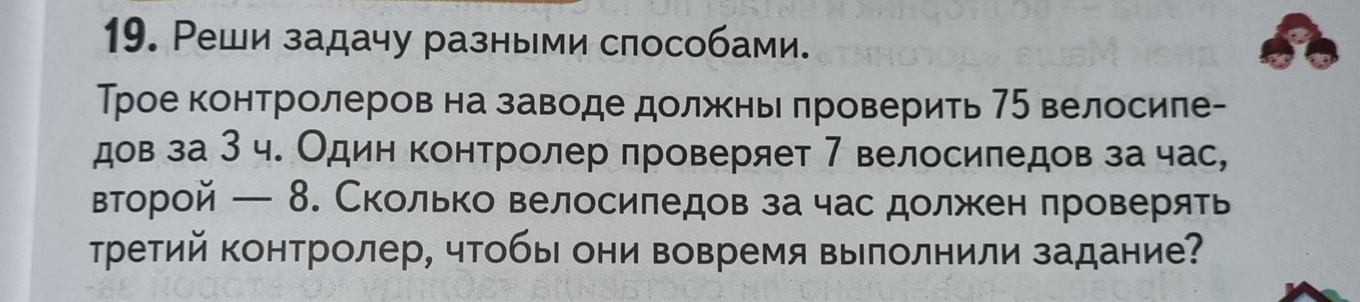 1) 75 : 3 = 25 велосипедов должны проверить три контролёра вместе за 1 час;