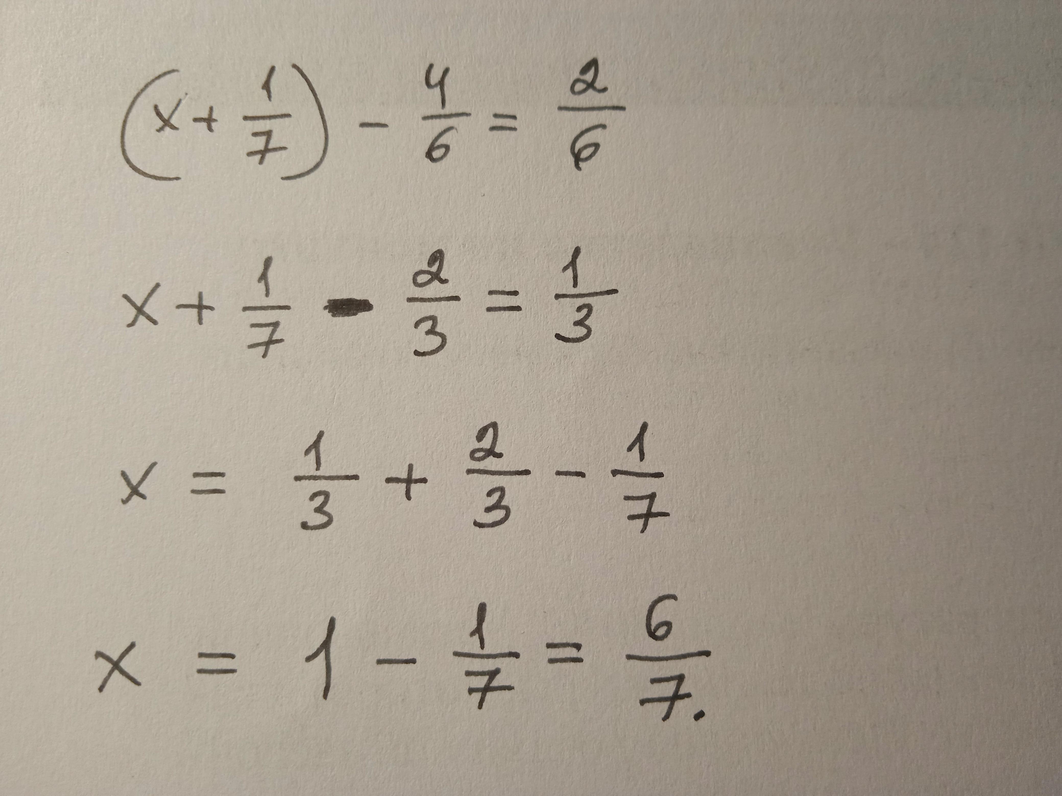 (x-1/7)-4/6=2/6. x-1/7=2/6+4/6. x-1/7=1. x=1-1/7. x=7/7-1/7=6/7