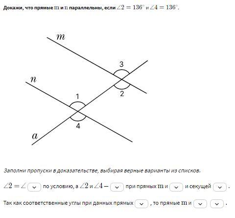 Докажи, что прямые m и n параллельны, если ∠2=136 и ∠4=136