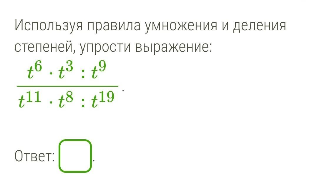 (t⁶*t³:t⁹)/(t¹¹*t⁸:t¹⁹)=(t⁶⁺³⁻⁹)/(t¹¹⁺⁹⁻¹⁹)=1/1=1