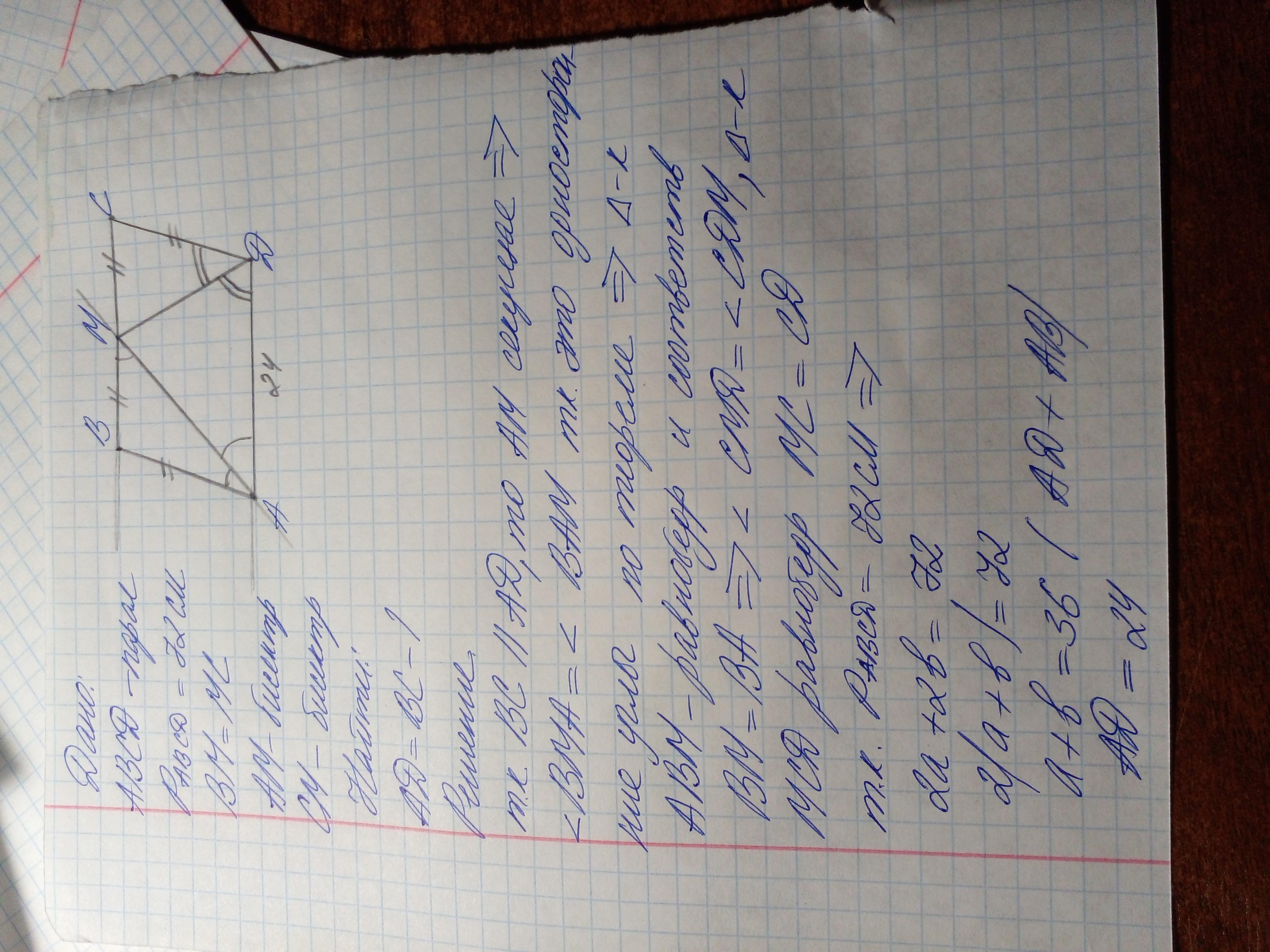 16. В параллелограмме ABCD, периметр которого 72 см, биссектрисы углов A и D пересекаются на стороне ВС в точке М. Найдите большую сторону параллелограмма, если BM=MC.