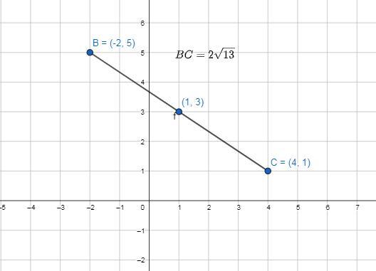 В нашем случае нужно найти расстояние между точками B и С ; а также найти середину отрезка BC