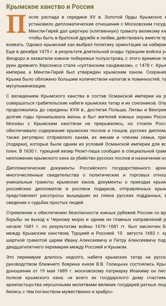 Крымское ханство и Россия осле распада в середине XV в. Золотой Орды Крымское ханство, став самостоятельным, установило дипломатические отношения с Московским государством: в 1474 г. крымский хан Менгли-Гирей дал шертную (клятвенную) грамоту великому князю Ивану II Васильевичу в том, чтобы быть в братской дружбе и любви, действовать вместе против врагов, земли друг друга не воевать. Однако крымский хан выбрал политику ориентации на набирающую силу Османскую империю. Еще в декабре 1475 г. в результате длительной осады турецкие войска уничтожили генуэзское княжество Феодоро и захватили южное побережье полуострова, с этого времени территория от Кефе (Феодосия) до руин древнего Херсонеса стала «султанским санджаком», с 1478 г. Крым сделался вассалом Османской империи, а Менгли-Гирей был утвержден крымским ханом. Сохранившееся христианское население Крыма было обложено большим количеством налогов и повинностей, турецкие власти усилили политику мусульманизации. с вхождением Крымского ханства в состав Османской империи на русские рубежи стали постоянно совершаться грабительские набеги крымских татар и их союзников. Опустошительные походы из Крыма продолжались до середины XVIII в., достигая Польши, Литвы и Венгрии. Борьба с крымскими татарами долгие годы пронизывала жизнь и быт жителей южных окраин России. Дипломатические отношения Москвы с Крымским ханством не прерывались, но стоили России очень дорого. Государство обеспечивало содержание крымских послов и гонцов, русских дипломатов, отправлявшихся в Крым, а также регулярно отправляло ханам, их женам и членам семьи, приближенным богатые «поминки» (подарки), которые были одним из условий Османской империи для возвращения русских, попавших в плен. В 1630 г. турецкий везир Резет-паша сообщил в специальной грамоте царю Михаилу Федоровичу о низложении крымского хана за убийство русских послов и назначении новым ханом Джан-Гирея. Дипломатические документы Российскаого государственного архива древних актов сохранили многочисленные свидетельства о политических и торговых отношениях с Крымским ханством, уникальные грамоты крымских ханов, документы о приездах крымских послов, статейные списки российских дипломатов и росписи подарков, отправленных крымским ханам. Особый интерес представляют расспросы вышедших из плена русских подданных, в которых сохранились ценные сведения о судьбах простых людей. Стремление к обеспечению безопасности южных рубежей России со временем стало составной частью борьбы за выход к Черному морю и одним из главных направлений российской внешней политики. В начале 1681 г. по результатам войны 1676-1681 гг. был эаключен Бахчисарайский мирный договор между Крымским ханством, Турцией и Россией. 10 августа 1682г. крымский хан Мурат-Гирей своей шертной грамотой царям Ивану Алексеевичу и Петру Алексеевичу подтвердил условие о ненарушении двадцатилетнего перемирия между Россией и Крымом. Это перемирие длилось недолго, набеги крымских татар на русские рубежи продолжались. Под руководством ближнего боярина князя В.В. Голицына состоялись Крымские походы 1687 и 1689 гг. В доношении от 19 мая 1689 г. московскому патриарху Иоакиму он писал о военных действиях против и твоего всеблаженнейшего полков крымского хана: «и всего их государского дому счастием, архипастырства неусыпными
