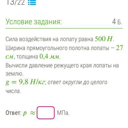 p=F/S; S=a*b=0.27*0.0004=0.000108; p=500/0.000108=4629629Па=4,6МПа. Вроде так, непонятно, правда, зачем задан g?