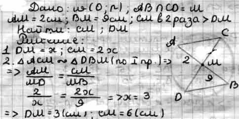 Хорды АВ и СD окружности пересекаются в точке М. АМ = 2см, ВМ = 9см, а отрезок СМ в 2 раза больше отрезка DМ. Найдите отрезки СМ и DМ.