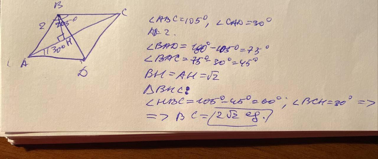 В параллелограмме ABCD проведены диагонали AC и BD. Сторона АВ равна 2, угол CAD = 30, угол АВС = 105. Найдите ВС