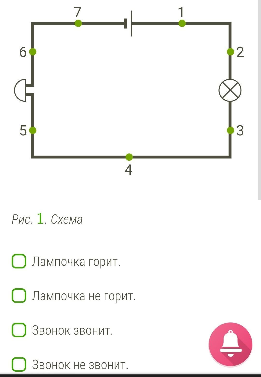Звонок и лампа соединены последовательно. Если в точке 5 находится разомкнутый ключ, то вся цепь разомкнута, лампочка не горит и звонок не звонит.