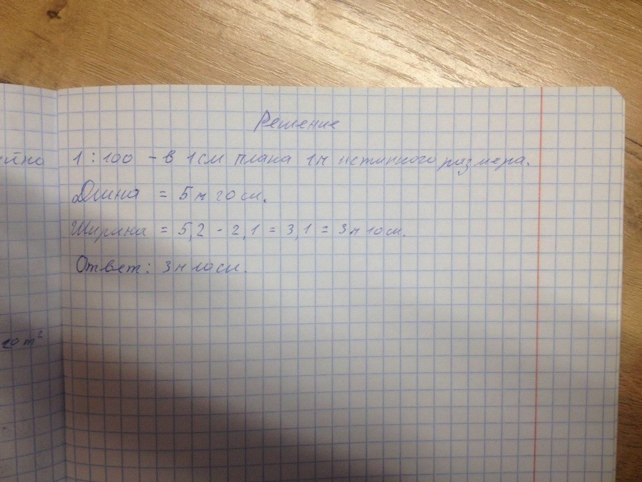 длина пола на плаге 5.2 см, ширина на 2.1 см меньше. Чему равны истинные размеры комнаты,если масштаб равен 1:100?СРОЧНОО ПЛИСС!!!!!