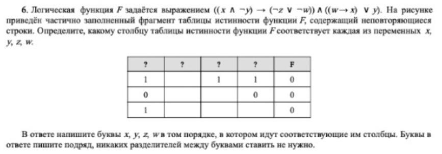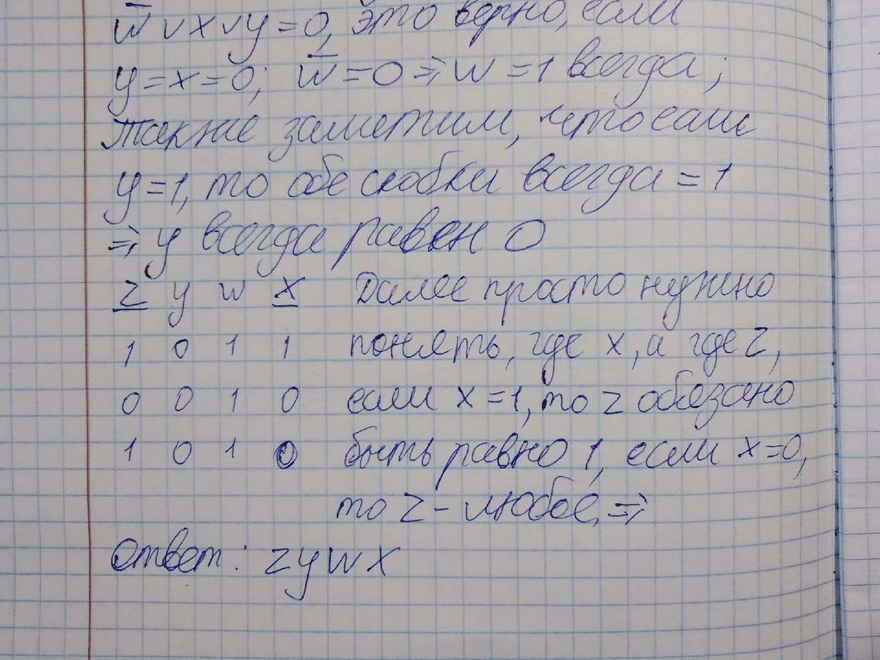 Остается 3 и 4 столбик, так как у нас в нашей таблице есть столбик со всеми единицами (столбик w) - 3 или 4 столбик таблицы задания должен полностью состоять из единиц, так как в 4 есть 0 ⇒ 3 столбик состоит полностью из единиц ⇒ 3 столбик - w, а 4 столбик - x