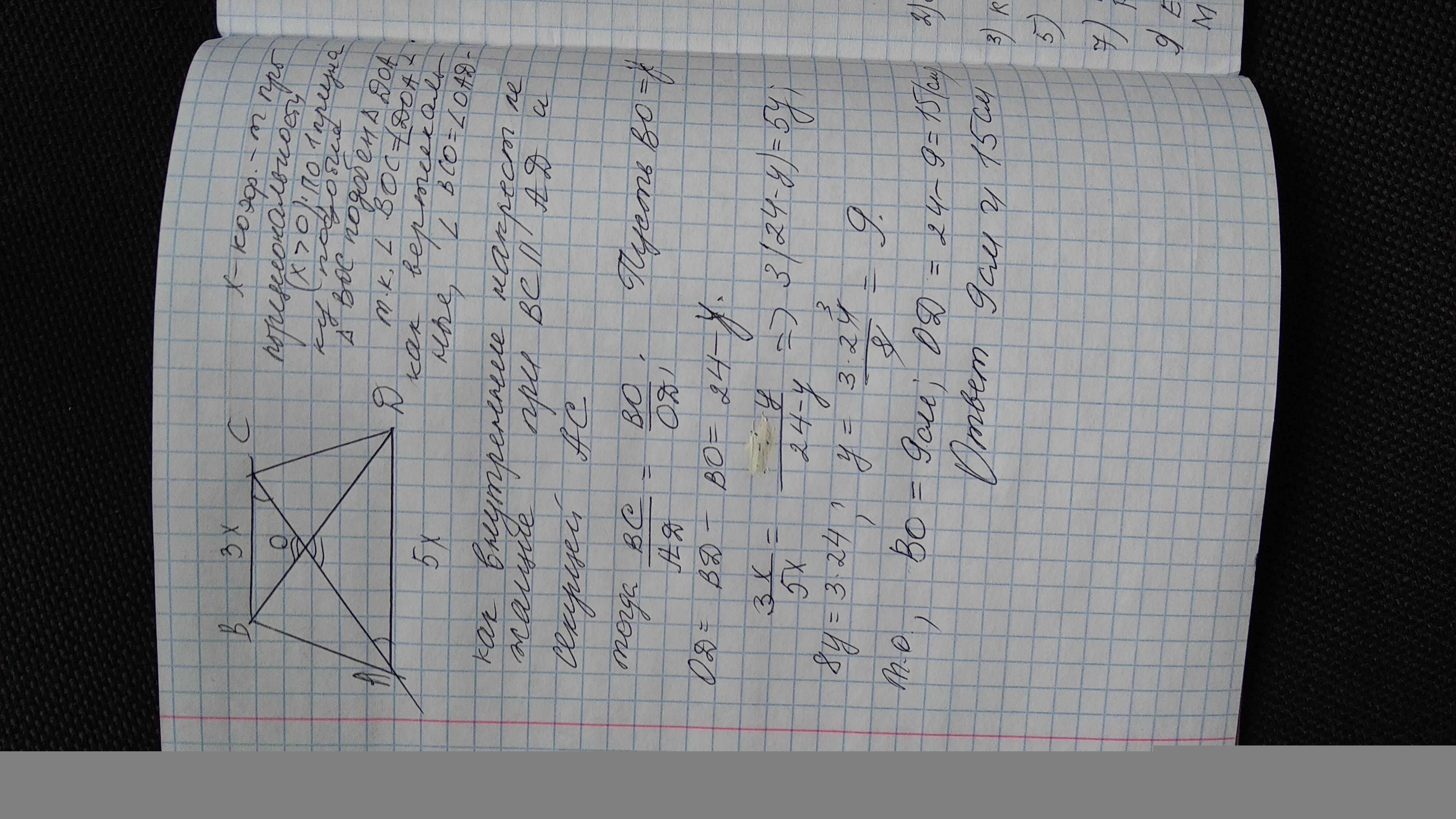 У трапеції ABCD з основами AD i BC діагоналі перетинаються в точці О, ВС : АD = 3 : 5, ВD=24 см. Знайдіть ВО і ОD