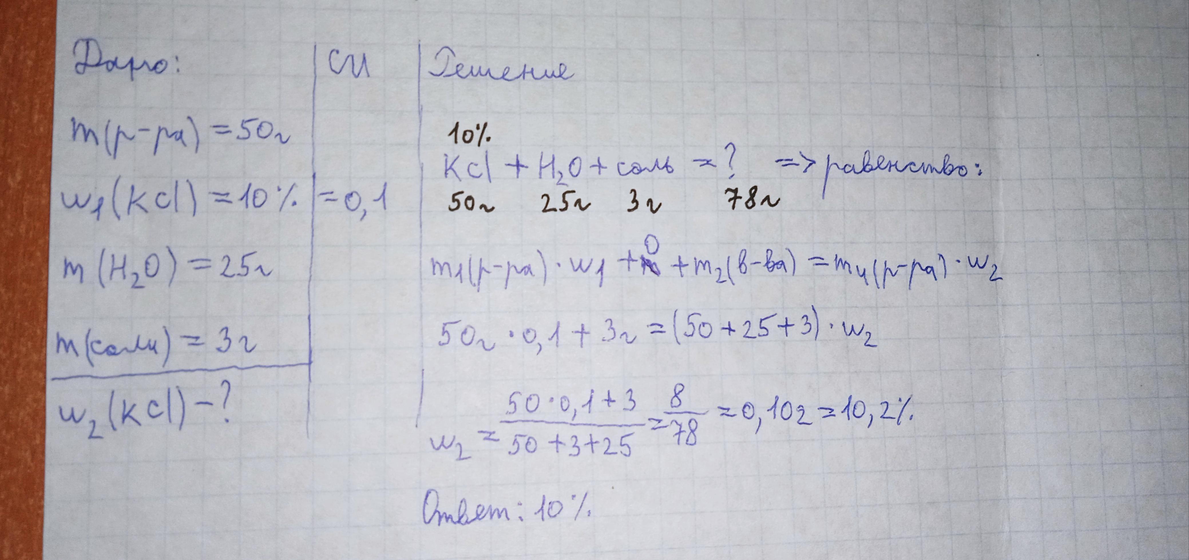 К 50 г 10%-ного раствора хлорида калия добавили 25 г воды и 3 г соли. Вычислите массовую долю хлорида калия в образовавшемся растворе. Прошу вас!!!
