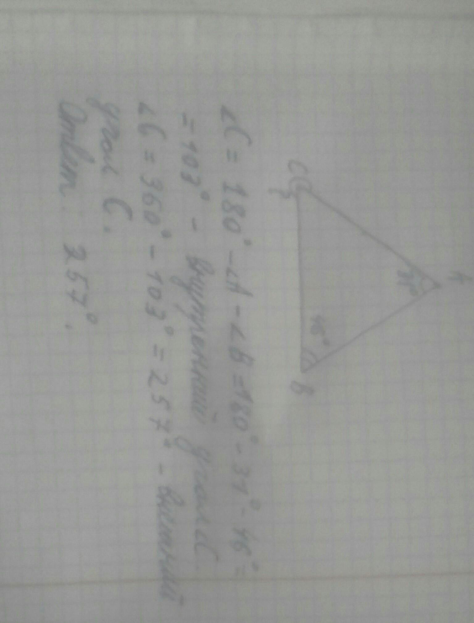 Объяснение 180-31-47=103 (180 потомучто углы треугольника всегда ровны 180). Потомучто 360-103=257градусов это внешний угол