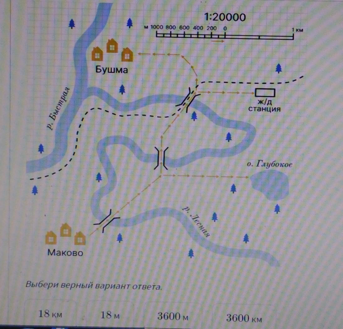 Используя данный масштаб карты, определи, какое расстояние от города Маково до железнодорожной станции