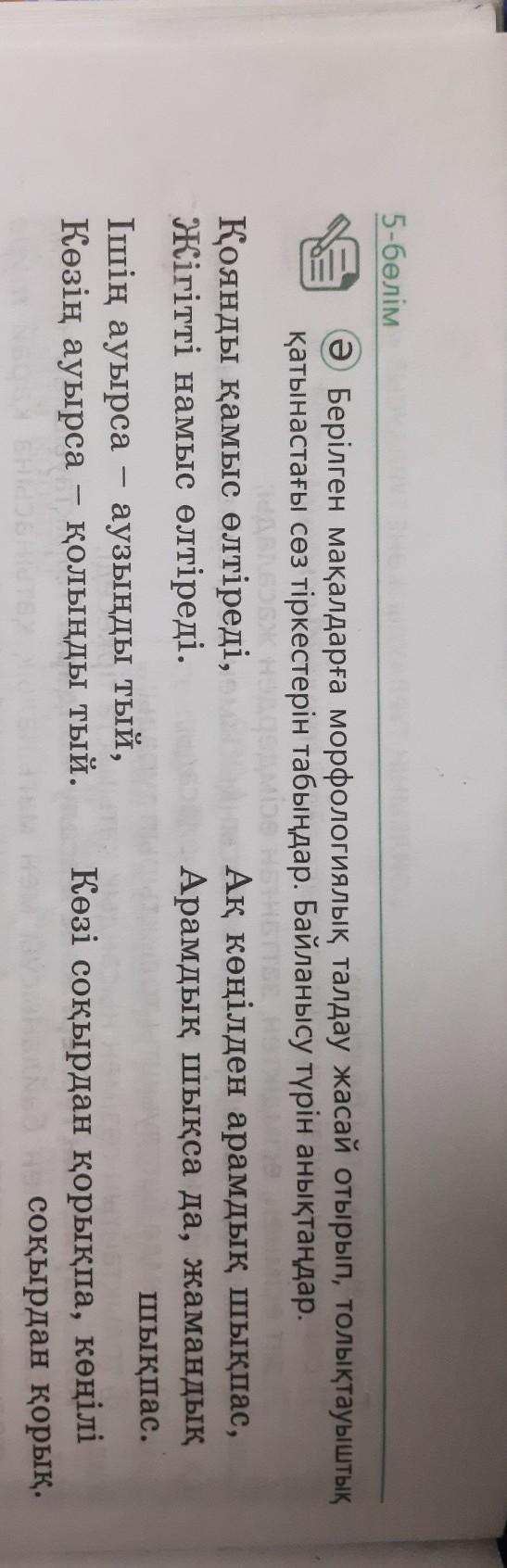 2. 5-белім ә Берілген мақалдарға морфологиялық талдау жасай отырып, толықтауыштық қатынастағы сөз тіркестерін табыңдар. Байланысу түрін анықтаңдар. Ақ көңілден арамдық шықпас, Арамдық шықса да, жамандық шықпас. Қоянды қамыс өлтіреді, Жігітті намыс өлтіреді. Ішің ауырса – аузыңды тый, Көзің ауырса – қолыңды тый. Көзі соқырдан қорықпа, көңілі соқырдан қорық.