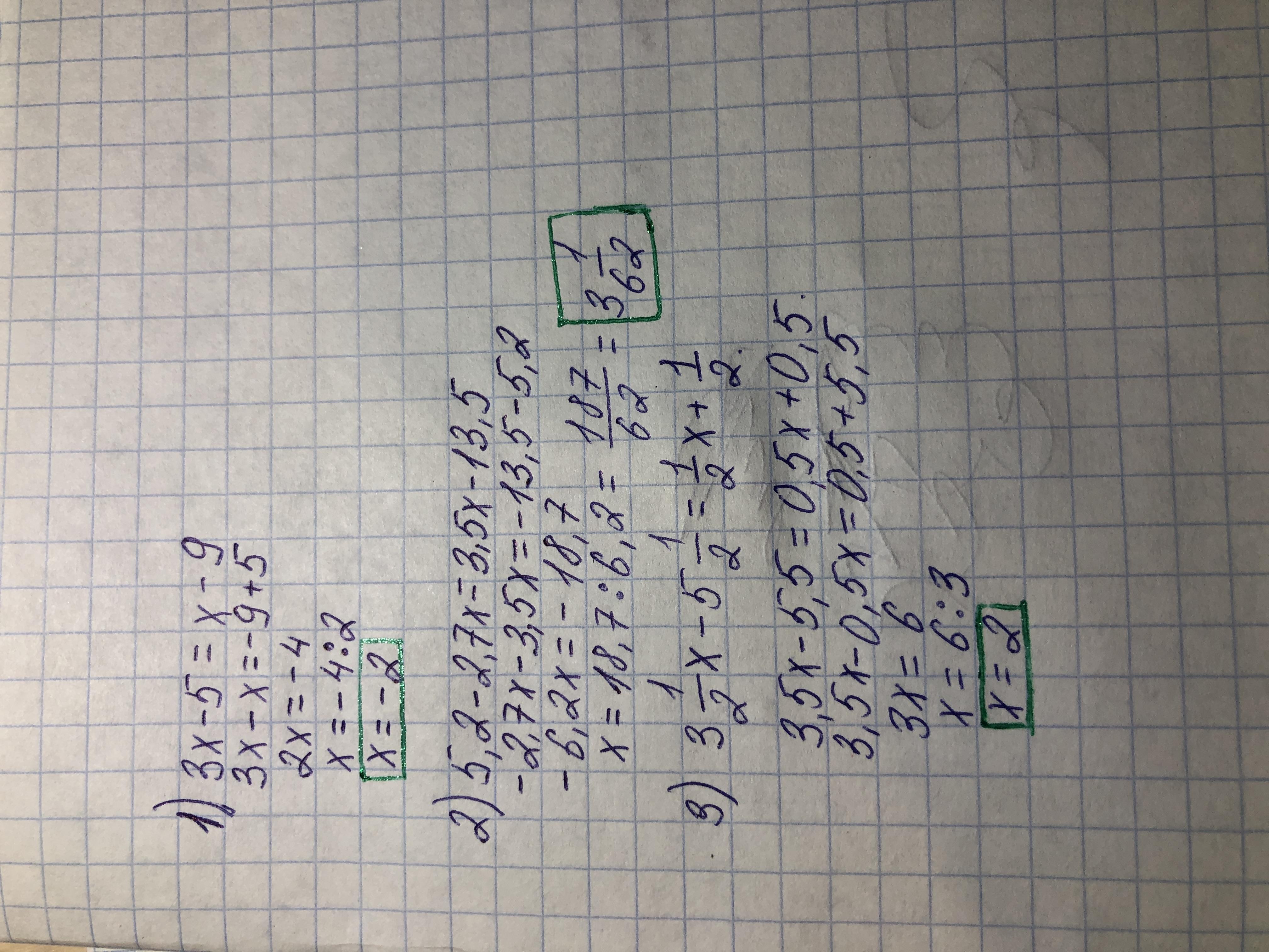 Решите уровнения.1)3×-5=×-9;2)5,2-2,7×=3,5×-13,5;3)3 1/2×-5 1/2=1/2×+1/2