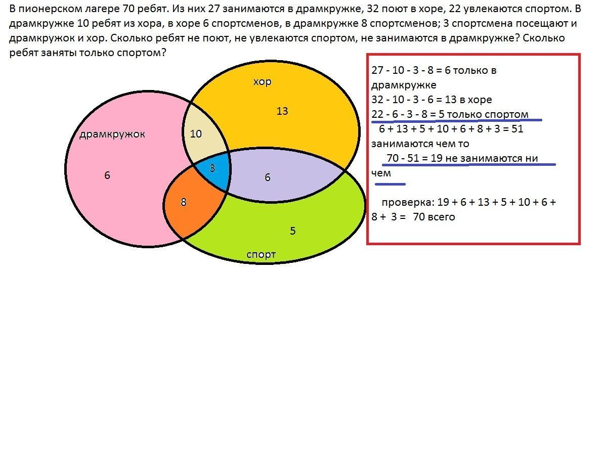 a) В летнем лагере было 70 ребят, 27 из них занимались в драмкружке, 32 – пели в хоре, 22 – спортсмены. В драмкружке 10 ребят из хора, в хоре – 6 спортсменов, в драмкружке – 8 спортсменов, 3 спортсмена посещают и драмкружок и хор. Сколько ребят увлекаются спортом?